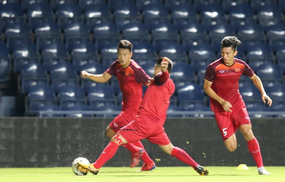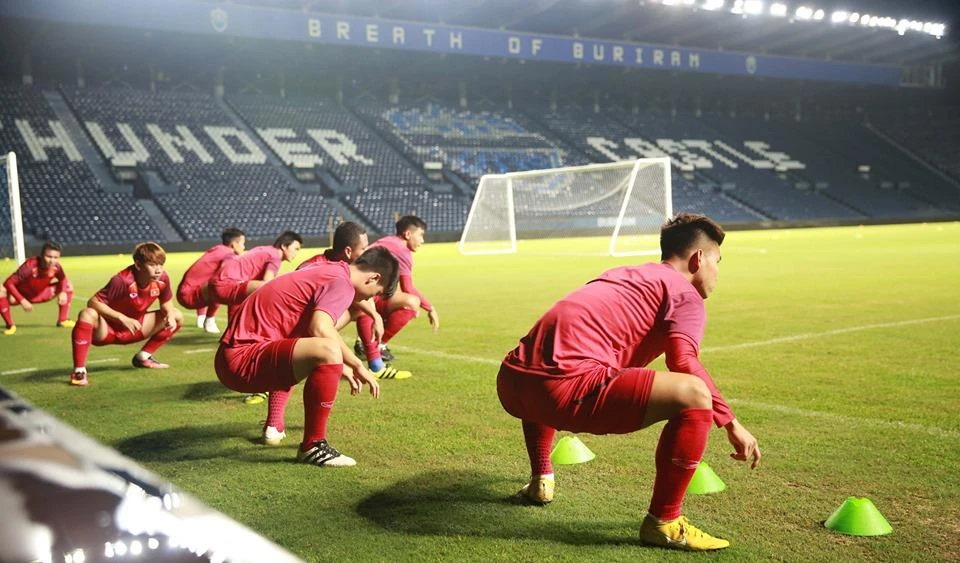 Đêm 3-6, đội tuyển Việt Nam ra sân tập chính Buriram để làm quen mặt cỏ và luyện các bài chiến thuật. HLV Park Hang-seo cho học trò khởi động rất kỹ cho các phóng viên tác nghiệp thoải mái trong 20 phút.