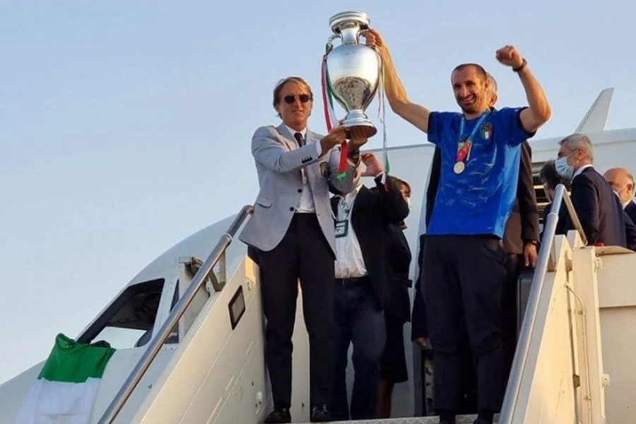 Chiếc cúp trong tay HLV Mancini và đội trưởng Chiellini đã về đến Rome ứng với cách chơi chữ chọc người Anh: “Football is coming to Rome”.