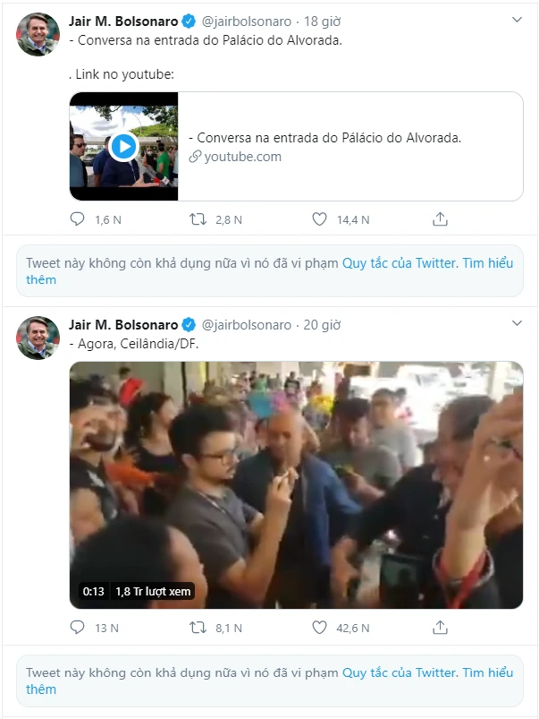 Hai đoạn video của Tổng thống Brazil, ông Jair Bolsonaro, đã bị Twitter gỡ bỏ.