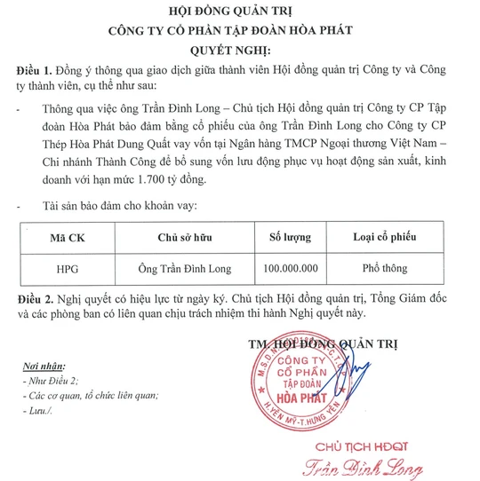 Theo đó, để bổ sung vốn lưu động 1.700 tỉ đồng phục vụ hoạt động sản xuất, kinh doanh cho Công ty cổ phần Thép Hòa Phát Dung Quất, ông Trần Đình Long, Chủ tịch HĐQT đã quyết định đưa 100 triệu cổ phiếu HPG thuộc sở hữu cá nhân (trị giá khoảng hơn 3.200 tỉ đồng theo thị giá hiện hành) làm tài sản đảm bảo để vay vốn tại Vietcombank Chi nhánh Thành Công. HĐQT Tập đoàn Hòa Phát đã thông qua nội dung này.