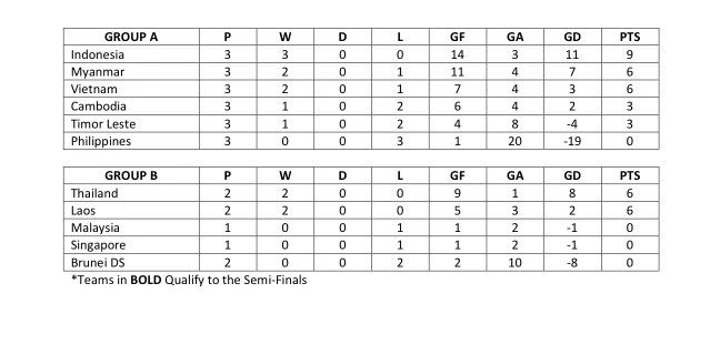 Chiến thắng này giúp Indonesia toàn thắng sau ba lượt trận giữ vững ngôi đầu. Trong khi đó Myanmar và Việt Nam cùng sáu điểm lần lượt xếp vị trí thứ nhì và ba của bảng A (Việt Nam kém hiệu số bàn thắng/bại, 11/4 so với 7/4).