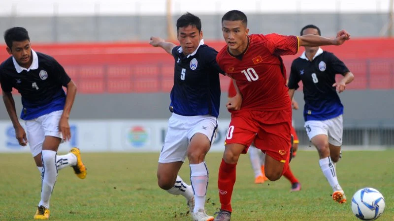 U-16 Campuchia (áo xanh) cũng có thể hình rất tốt.
