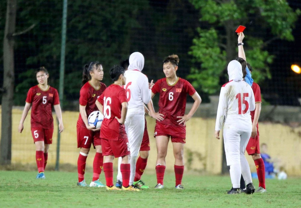Chiếc thẻ đỏ của Hải Linh khiến U-19 Việt Nam trải qua gần 10 phút sóng gió cuối trận. ẢNH: VFF