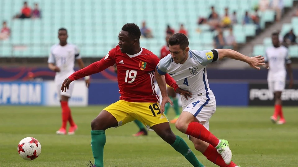Naby (19, Guinea) trong nỗ lực đi bóng qua trung vệ Cook của Anh