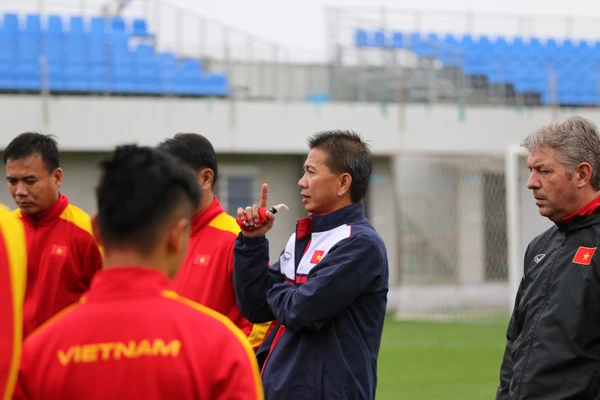 HLV Hoàng Anh Tuấn dặn dò cầu thủ trước buổi tập đầu tiên trên đất Hàn Quốc. Ảnh: VFF.