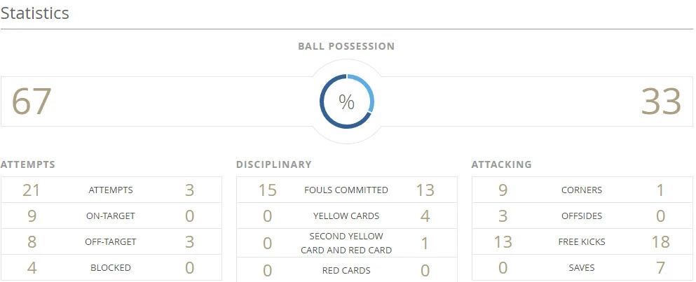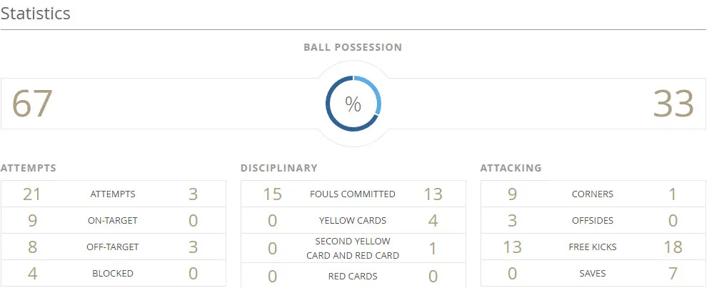 Thống kê sau trận đấu đã nói lên tất cả, U-20 Pháp cầm 67 % bóng tung ra đến 21 pha dứt điểm và ghi được 4 bàn thắng. Trong khi Việt Nam chỉ có vài cú sút vu vơ cầu may không chính xác trong những lần hiếm hoi có bóng bên phần sân đối phương.