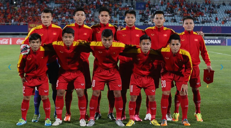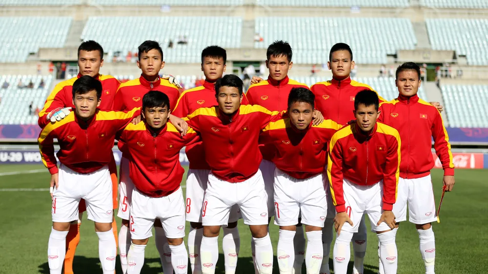 U-20 Việt Nam: Tiến Dũng, Tấn Tài, Đình Trọng, Tấn Sinh, Văn Hậu, Hoàng Đức, Hoàng Nam, Văn Hào, Quang Hải (C), Trần Thành, Đức Chinh