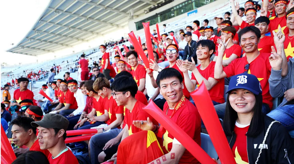 Các CĐV Việt Nam luôn cỗ vũ nhiệt tình cho các học trò HLV Hoàng Anh Tuấn trong từng đường bóng.