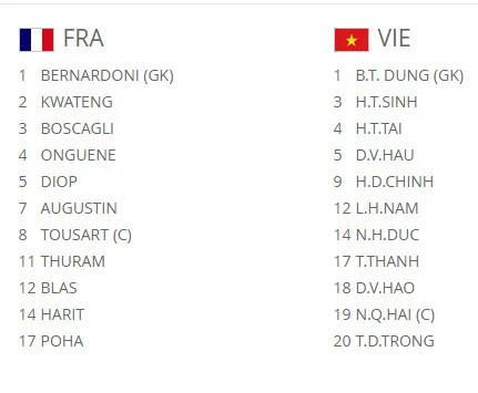 U-20 Pháp: Bernardoni, Boscagli, Kwateng, Onguene, Diop, Poha, Tousart (C), Thuram, Blas, Harit, Augustin.