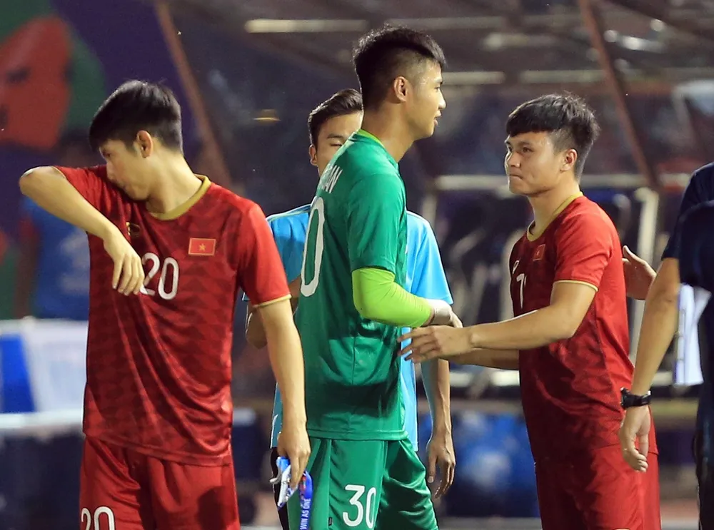 Quang Hải và đồng đội an ủi thủ thành Nguyễn Văn Toản. Ảnh: NGỌC DUNG
