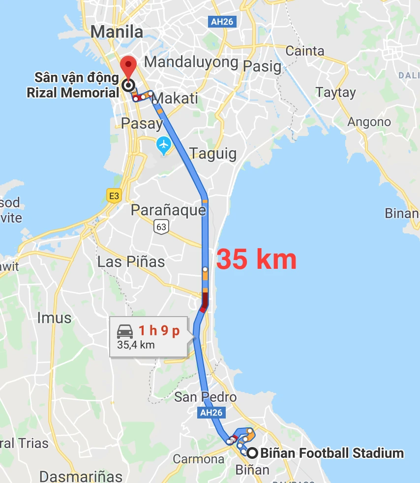Khoảng cách giữa hai SVĐ tranh tài môn bóng đá SEA Games 30 trên 35 km.