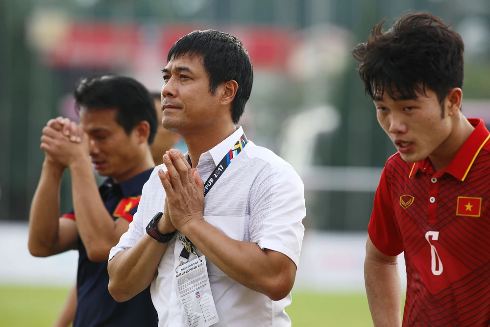 HLV Hữu Thắng chắp tay xin lỗi người hâm mộ trên sân.