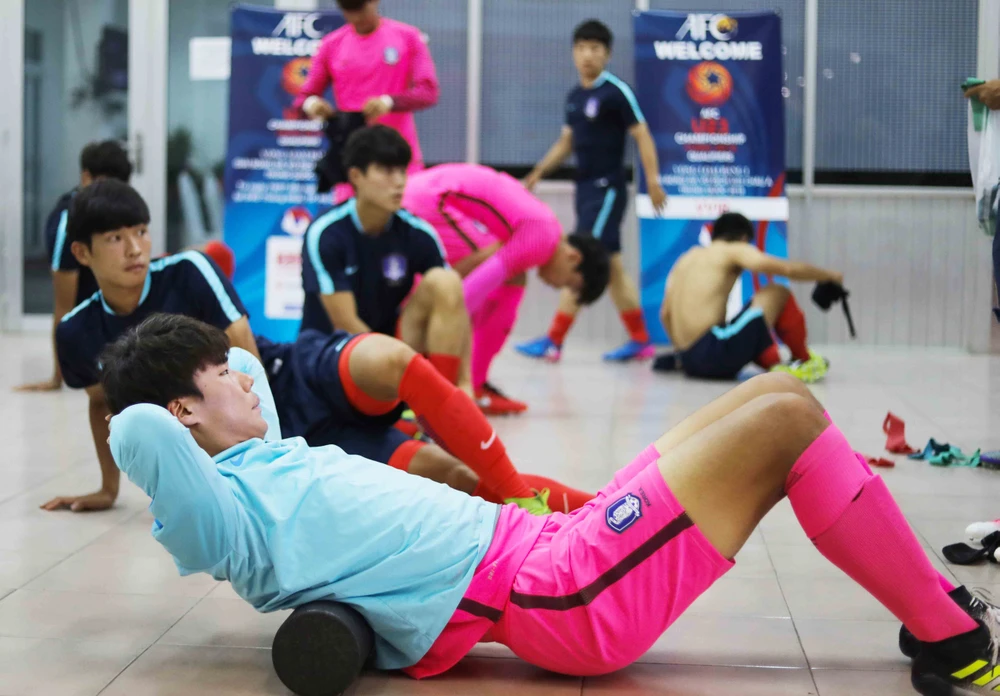 Các cầu thủ U-23 Hàn Quốc căng cơ ở đại sảnh sân Thống Nhất.