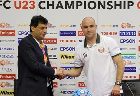 HLV Shahad Abdulghani (trái, Iraq) và HLV Felix Sanchez của chủ nhà Qatar.