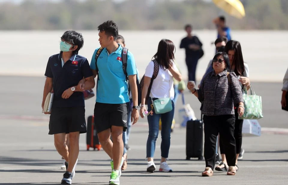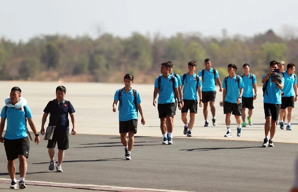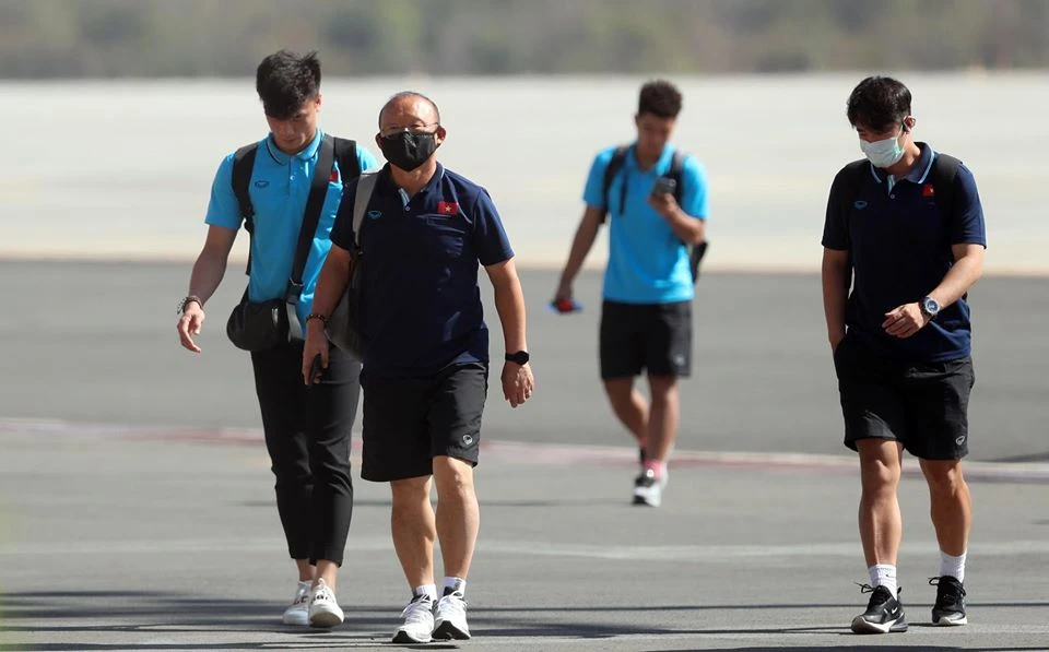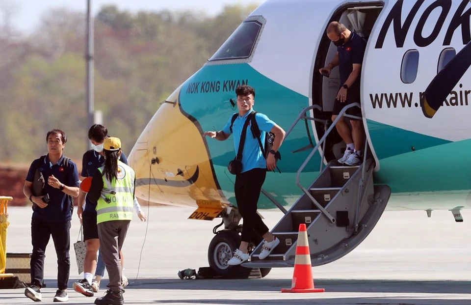 Trưa 6-1, thầy trò HLV Park Hang-seo đổ bộ xuống sân bay Buriram bằng chuyến bay từ Bangkok của hãng hàng không NOK Air.