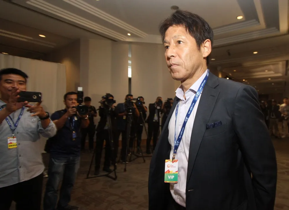 HLV Nishino của tuyển Thái Lan đến dự lễ bốc thăm.