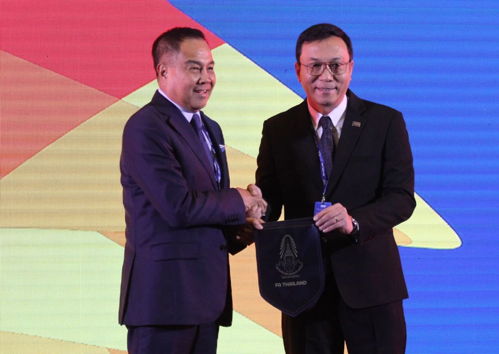 Phó Chủ tịch VFF Trần Quốc Tuấn kiêm Trưởng ban thi đấu AFC (phải) bắt tay cùng Chủ tịch LĐBĐ Thái Lan Somyot tại lễ bốc thăm.