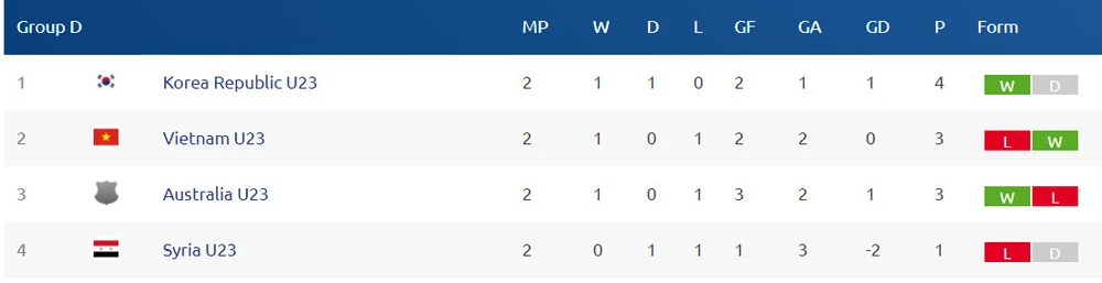 Hiện tại sau hai lượt trận, U-23 Hàn Quốc đang dẫn đầu bảng với 4 điểm, Việt Nam và Úc lần lượt xếp thứ hai và ba với 3 điểm, còn U-23 Syria xếp cuối với 1 điểm. Ở lượt trận cuối cùng, U-23 Việt Nam sẽ gặp U-23 Syria, còn U-23 Hàn Quốc gặp U-23 Úc.