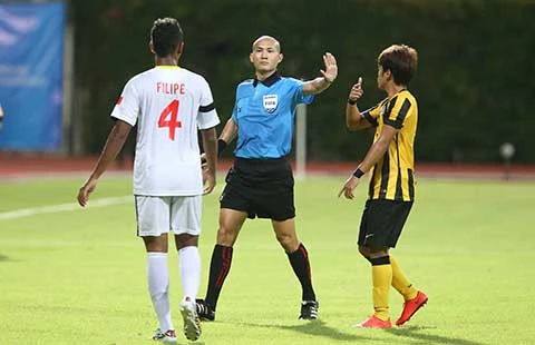 Trong khi Malaysia thắng khó Đông Timor (ảnh trên) thì HLV Miura và Trưởng đoàn Dương Vũ Lâm ngồi trên khán đài quan sát, ghi chép cẩn thận. Ảnh: A.PHƯƠNG - D.HẢI