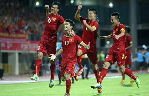 Toàn đội ăn mừng bàn nâng tỉ số 4-0 từ quả đá phạt thật độc và điệu nghệ của Công Phượng. Ảnh: ANH HẢI