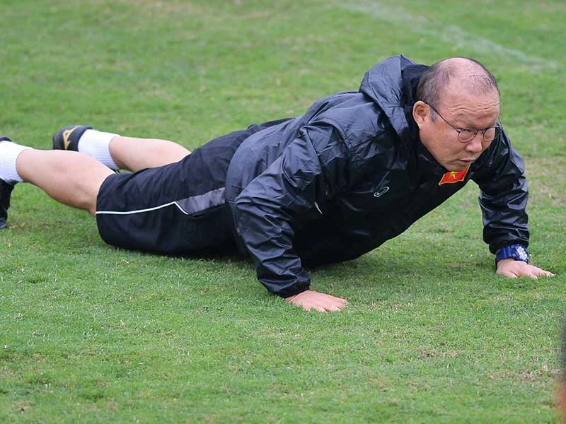 Vẫn biết rằng đó chỉ là bài tập bình thường nhưng “độ khó” mà cầu thủ thấy bở hơi tai là phải thực hiện đúng với tần suất cao đồng thời không được “ăn gian” mà khi thị phạm HLV Park Hang-seo nhắc nhở học trò không được để bụng chạm đất hay mông nhô lên. Thậm chí ông thầy tuổi 60 Park Hang-seo còn đi kiểm tra để chỉnh từng cầu thủ phải tập đúng, tập đủ.