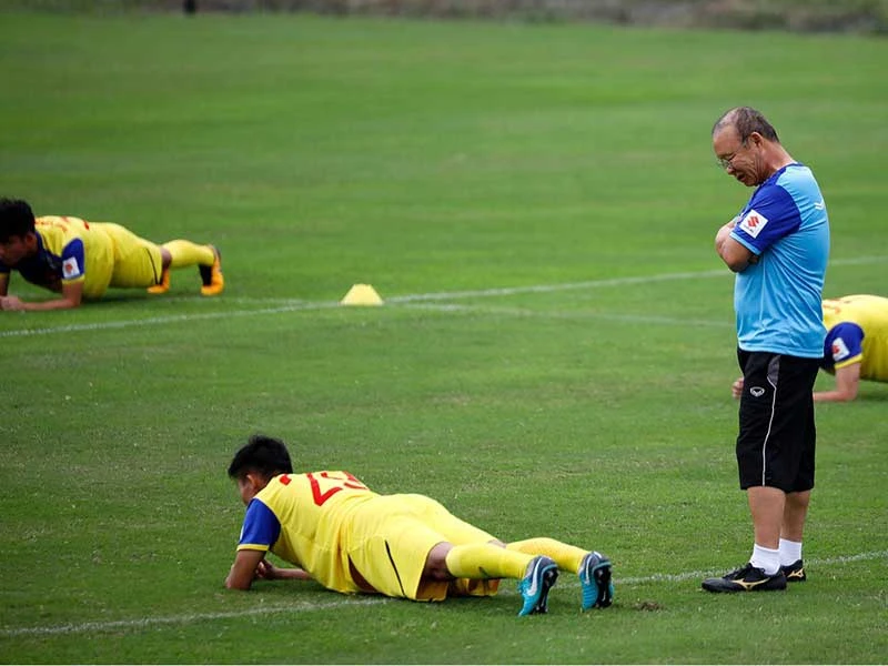 Thầy Park kiểm tra nghiêm ngặt các cầu thủ thực hiện những bài tập nặng. Ảnh: NGỌC DUNG