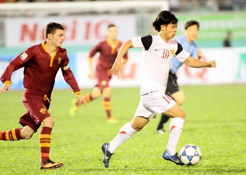 Phút 52, Công Phượng thực hiện cú sút xa rất căng từ ngoài vòng cấm bật người hậu vệ Roma ra hết biên ngang.