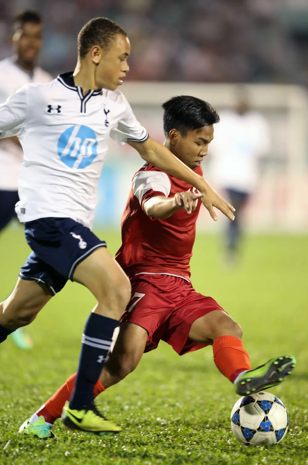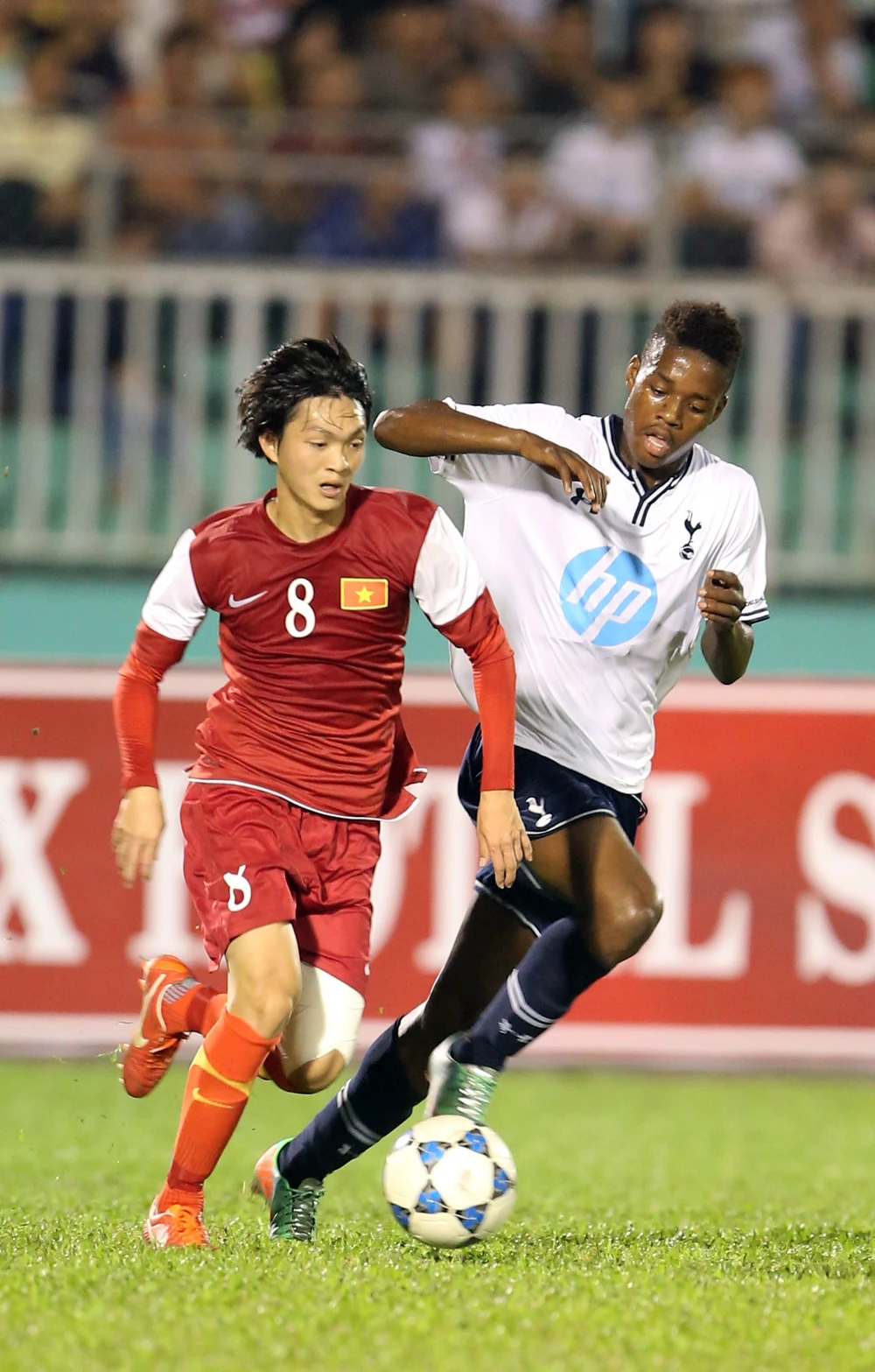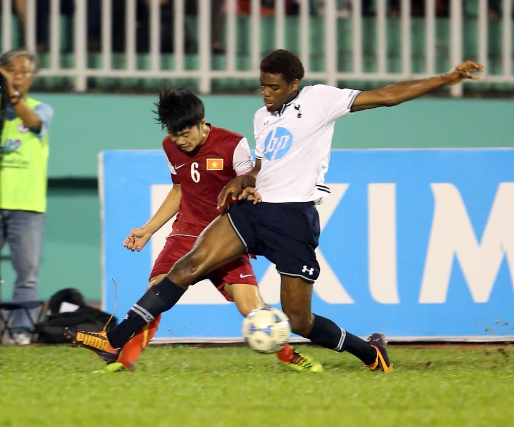 Tuấn Anh nổ lực đi bóng vượt qua cầu thủ U19 Tottenham. Ảnh: XUÂN HUY