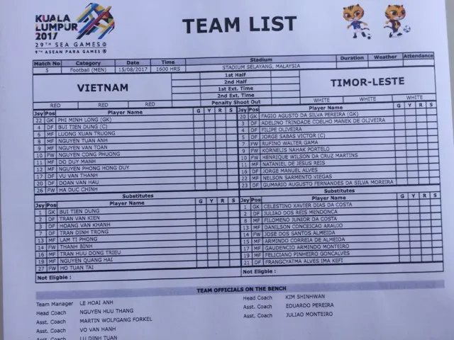 U-22 Đông Timor: Augusto Fereira, De Oliveira, Filipe Oliveira, Sabas Victor, Walter Gama, Portelo, Cruz Martin, De Jesus Reis, Manuel Alves, Viegas, Moreira.