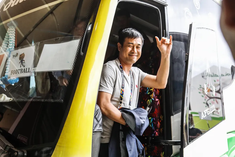 HLV Hữu Thắng và các cầu thủ U-22 Việt Nam đến sân rất sớm.