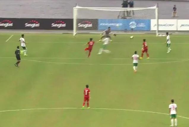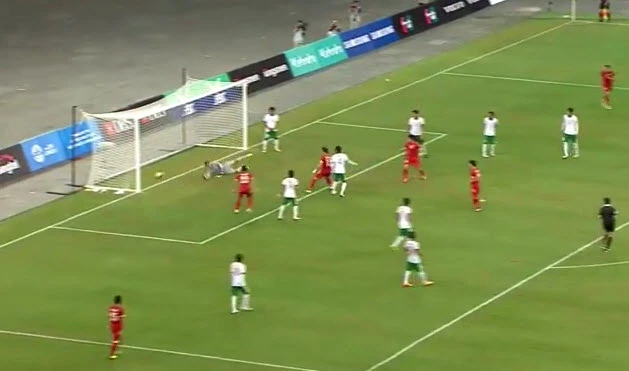 Phút 9, Adam Alis của có pha đá phạt góc vào cho Agung bật cao đánh đầu vọt xà.