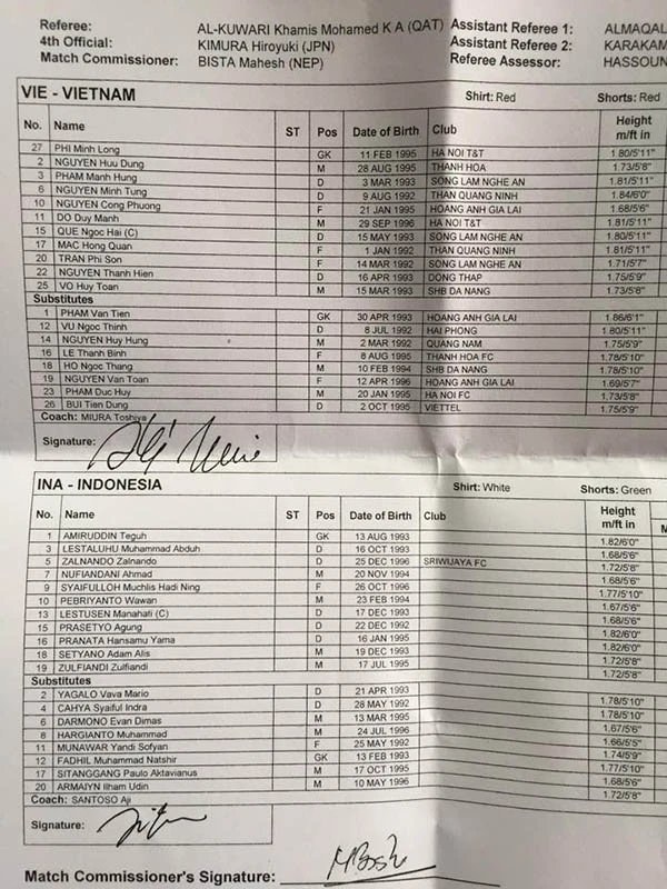 U23 Việt Nam ra sân với trang phục toàn đỏ, U23 Indonesia ra sân với trang phục áo trắng, quần xanh, tất trắng.