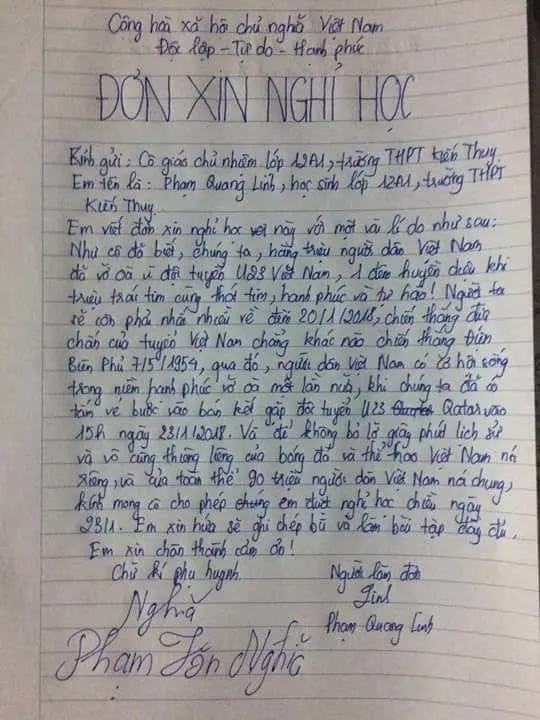 Rõ ràng U-23 Việt Nam đang là cái tên gây sốt với người hâm mộ bóng đá Việt Nam nói chung và cả nước nói riêng. Vì trận đấu này, đã xảy ra nhiều trường hợp bi hài. Đó là chuyện một học sinh viết đơn xin nghỉ học để xem U-23 Việt Nam thi đấu. Điều đáng nói đơn xin nghỉ của học sinh này lại có chữ ký đồng ý của phụ huynh hẳn hoi.