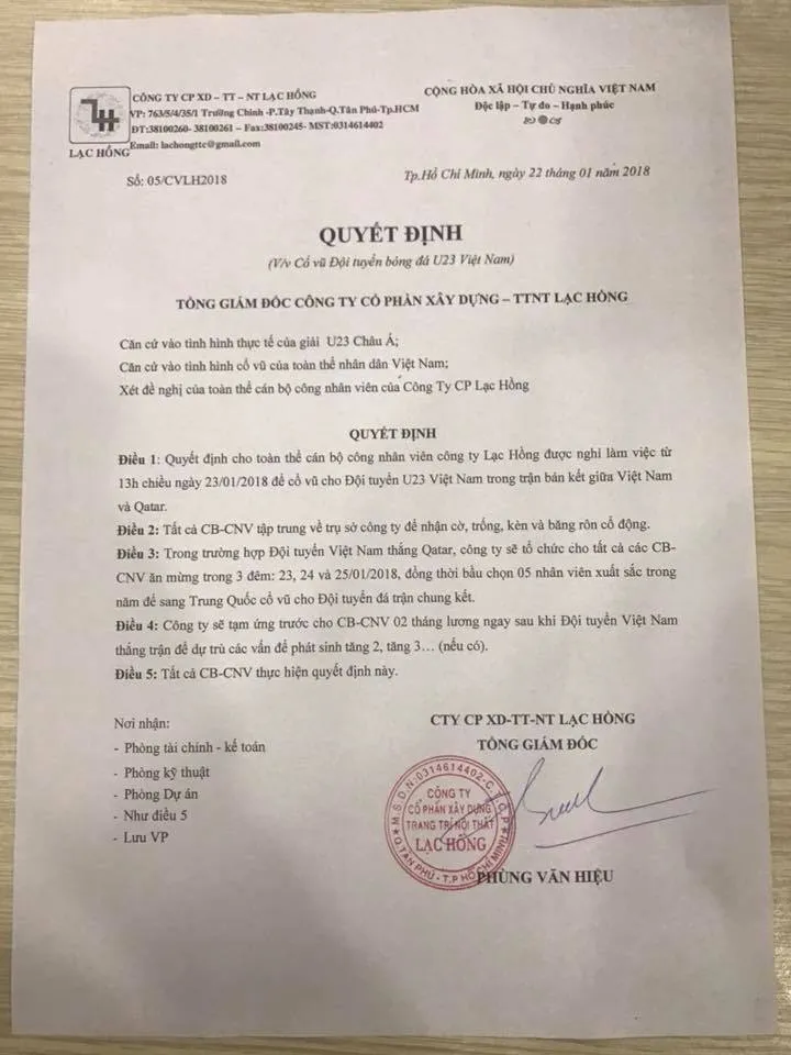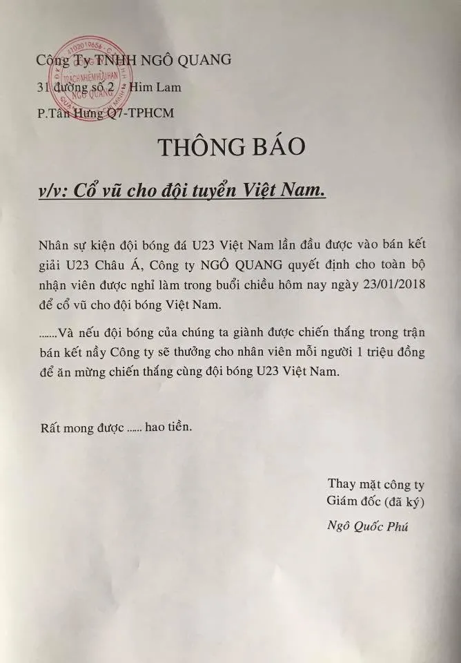 Đặc biệt nhất là điều ba, “Trong trường hợp đội tuyển Việt Nam (đúng ra là U-23 Việt Nam) thắng Qatar, công ty sẽ tổ chức cho CB-CNV ăn mừng 3 đêm 23, 24 và 25-1-2018. Đồng thời bầu chọn 5 nhân viên xuất sắc trong năm để sang Trung Quốc cổ vũ cho đội tuyển đá trận chung kết”.