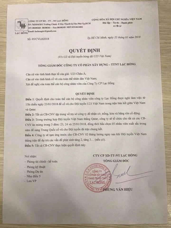 Giám đốc nhiều công ty cũng chịu chơi cho nhân viên nghỉ làm để xem và cổ vũ cho U-23 Việt Nam. Mới đây nhất, tổng giám đốc một công ty đã ban hành một quyết định cho nhân viên nghỉ làm xem U-23 thi đấu rất hài hước. Theo đó, trong quyết định gồm tất cả 5 điều của tổng giám đốc công ty cổ phần xây dựng - TTNT Lạc Hồng, toàn bộ nhân viên của công ty này sẽ được nghỉ làm việc từ 13 giờ để chuẩn bị xem trận bán kết giữa U-23 Việt Nam và U-23 Qatar.