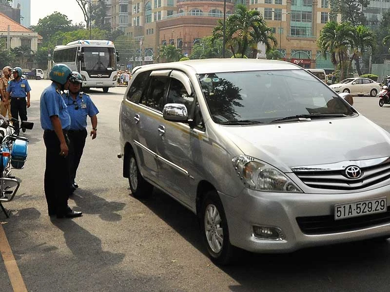 Lực lượng chức năng xử lý một xe Uber vi phạm do không đủ điều kiện hoạt động. Ảnh: MP