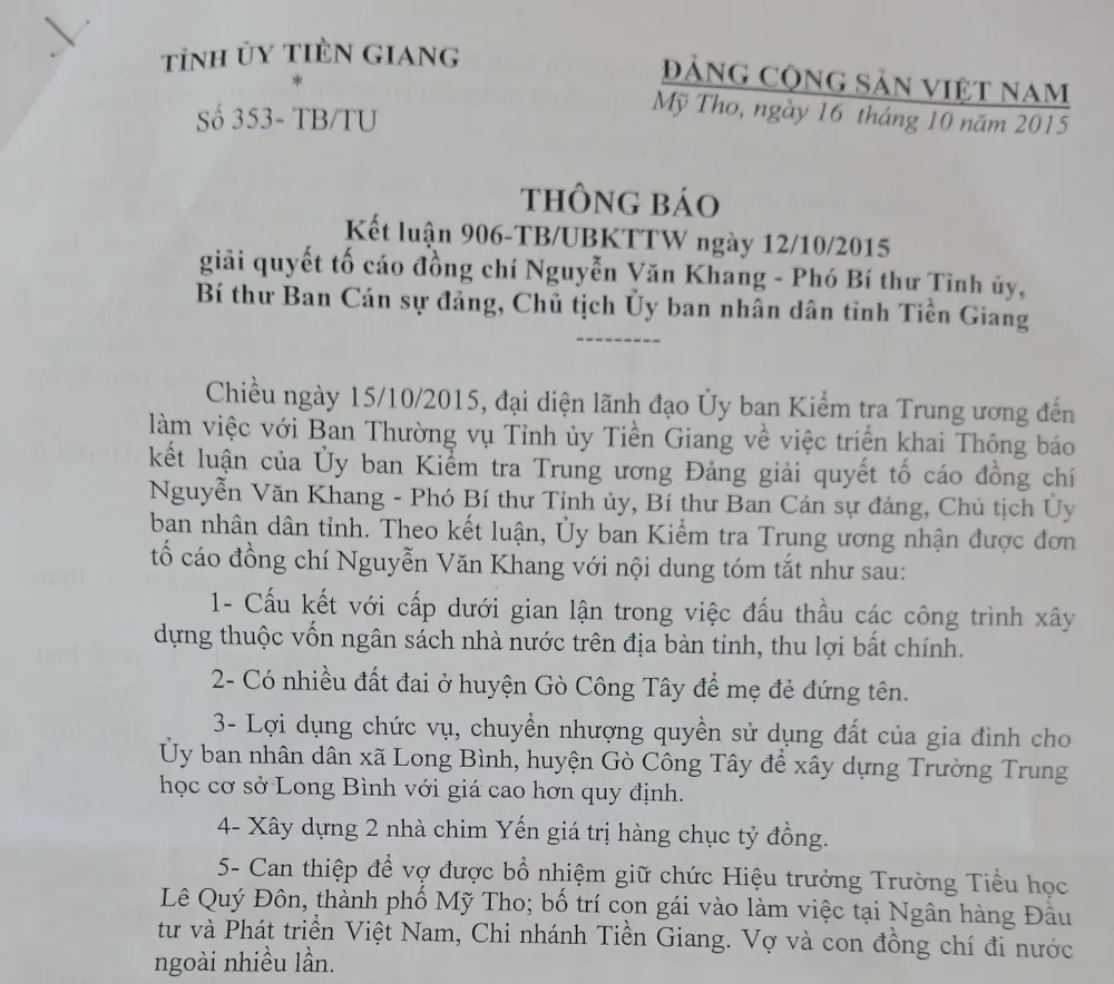 Ngày 19-10, Tỉnh ủy tỉnh Tiền Giang đã họp báo thông báo kết luận của Ủy ban Kiểm tra (UBKT) Trung ương về việc giải quyết tố cáo ông Nguyễn Văn Khang - Phó Bí thư Tỉnh ủy, Bí thư Ban Cán sự Đảng, Chủ tịch UBND tỉnh Tiền Giang. Theo UBKT Trung ương, cả năm nội dung tố cáo chủ tịch tỉnh Tiền Giang qua kiểm tra đều không có cơ sở.