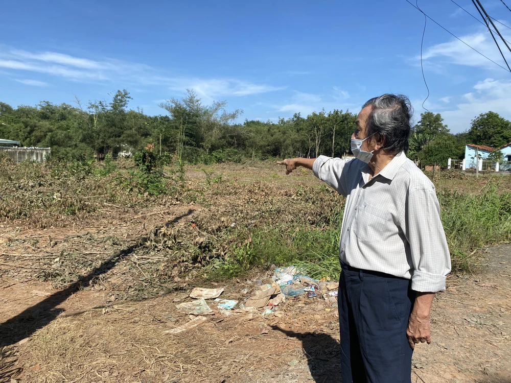 Cha của ông Tính đứng bên mảnh vườn cao su bị cưa hạ hoàn toàn. Ảnh: ĐẶNG LÊ
