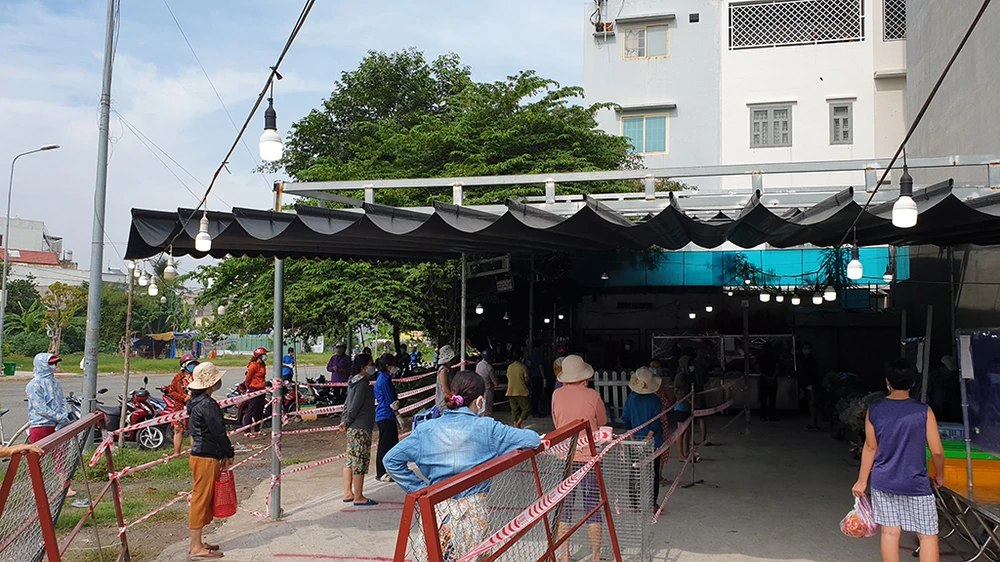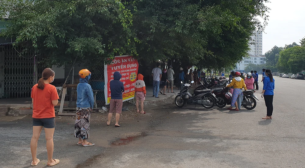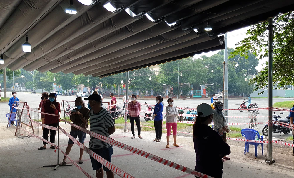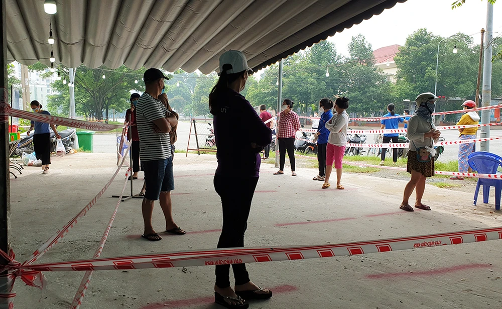 Người dân được yêu cầu xếp hàng từ xa, đảm bảo giãn cách, chống dịch. Ảnh: NT