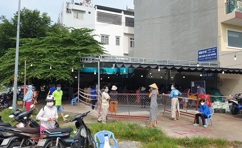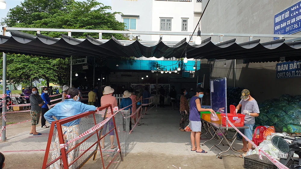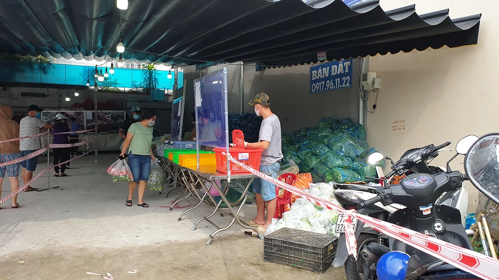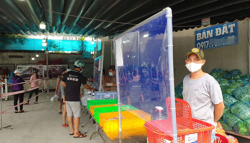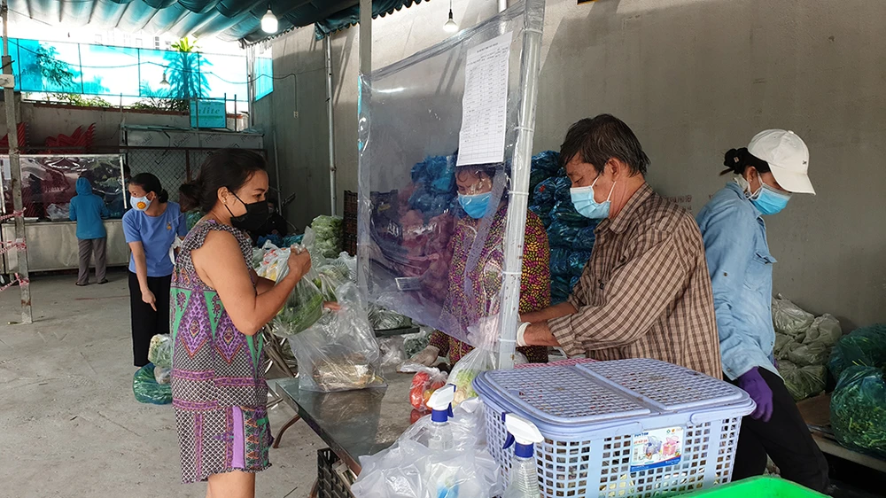 Để đảm bảo chống dịch, UBND phường Tân Hưng Thuận tổ chức thiết kế khu vực để hàng cũng như nơi giao dịch có tấm chắn giọt bắn nhằm đảm bảo chống dịch. Ảnh: NT