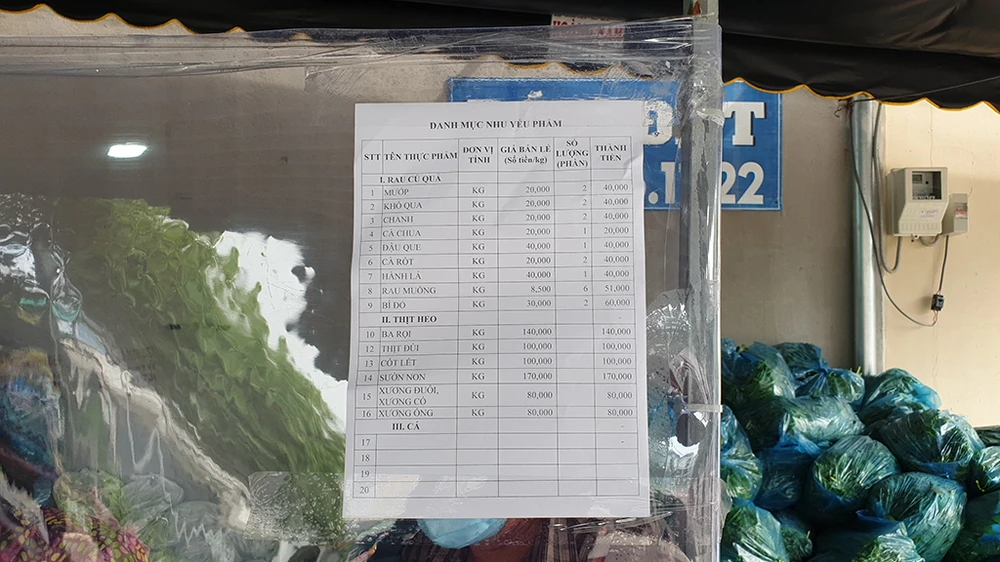 Các quầy hàng được niêm yết giá cụ thể. Để tránh người dân mua bán lâu, UBND phường quy định chỉ bán theo bịch từng kg chứ không bán lẻ. Ảnh: NT
