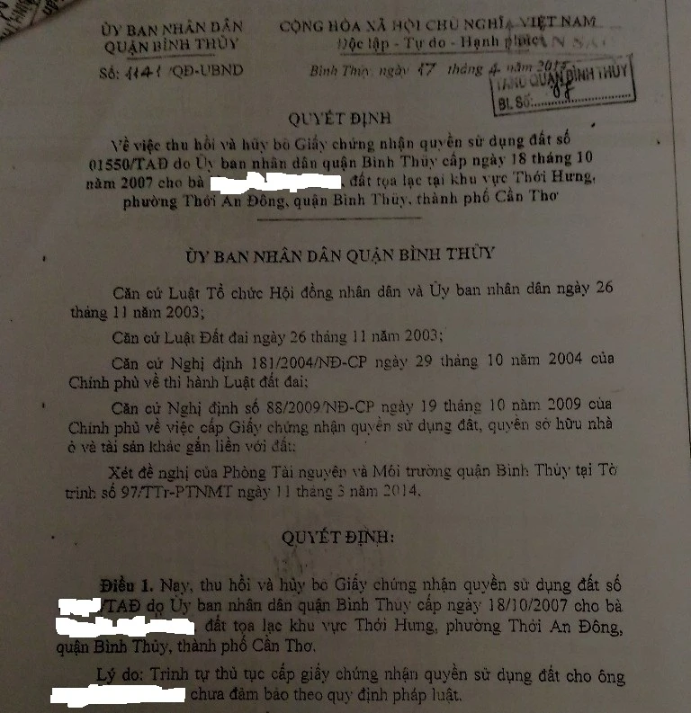 Quyết định 1141 của UBND quận Bình Thủy bị TAND TP Cần Thơ tuyên hủy ngày 13-7. Ảnh: NN