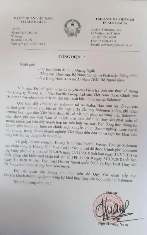 Đại sứ đặc mệnh toàn quyền Việt Nam tại Úc, Ngô Hướng Nam đã có Công điện minh định việc khai thác hải sản Công ty Hoàng Kim Việt Pacific tại Solomon.