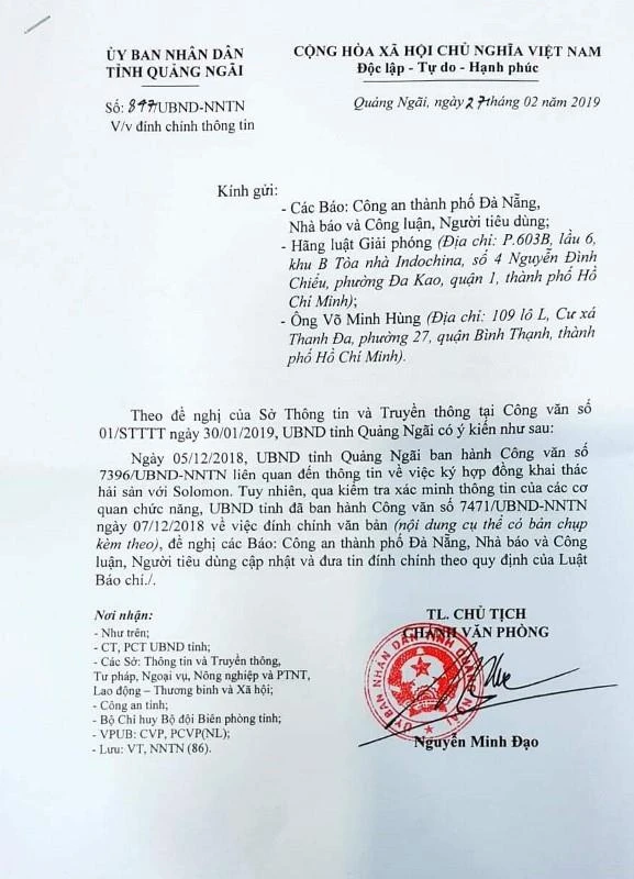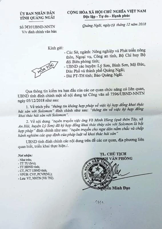 Công văn đính chính thông tin của UBND tỉnh Quảng Ngãi.