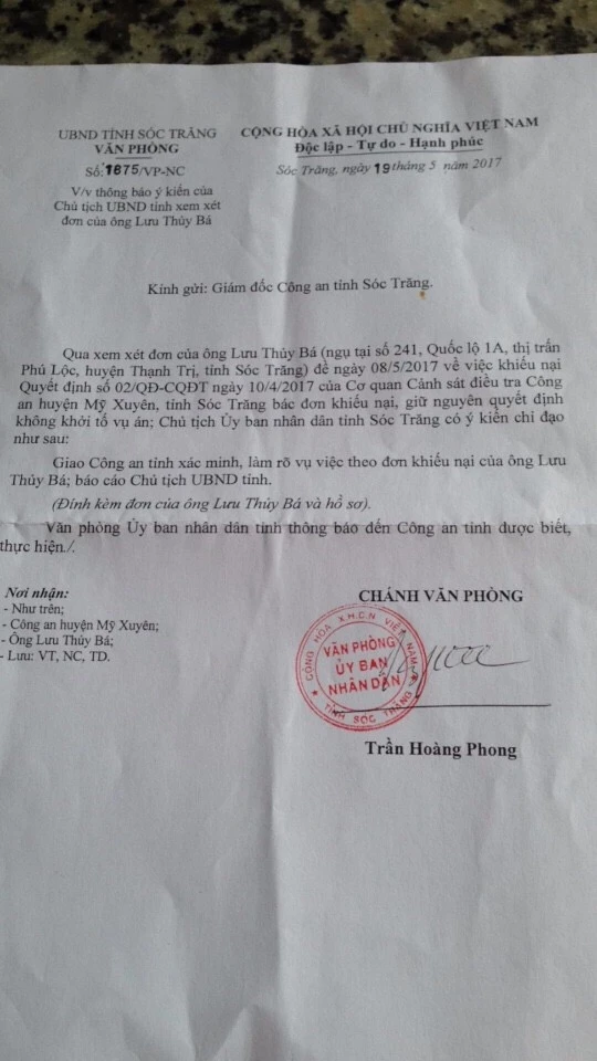 Theo đó sau khi xem xét đơn của ông Bá khiếu nại về việc Công an huyện Mỹ Xuyên bác đơn khiếu nại với yêu cầu khởi tố vụ án khởi tố bị can, Chủ tịch UBND tỉnh có ý kiến chỉ đạo như sau: Giao cho công an tỉnh xác minh làm rõ vụ việc theo đơn khiếu nại của ông Lưu Thủy Bá và báo cáo Chủ tịch UBND tỉnh. Kèm theo đơn của ông Bá UBND tỉnh chuyển theo hồ sơ tài liệu đính kèm cho công an tỉnh.