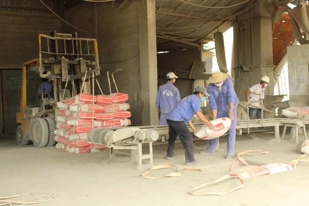 Công nhân Công ty CP 720 đóng bao xi măng tại cơ sở sản xuất. Ảnh: NHẪN NAM