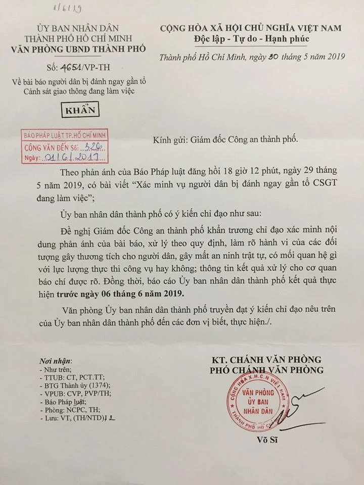 Về thông tin trên, văn bản gửi Giám đốc công an TP.HCM, UBND TP.HCM nêu rõ: Đề nghị Giám đốc Công an thành phố khẩn trương chỉ đạo xác minh nội dung của bài báo, xử lý theo quy định. “Làm rõ hành vi của các đối tượng gây thương tích cho người dân, gây mất an ninh trật tự, có mối quan hệ với lực lượng thực thi công vụ hay không; thông tin kết quả xử lý cho cơ quan báo chí được rõ. Đồng thời, báo cáo UBND thành phố kết quả thực hiện trước ngày 6-6-2019”.