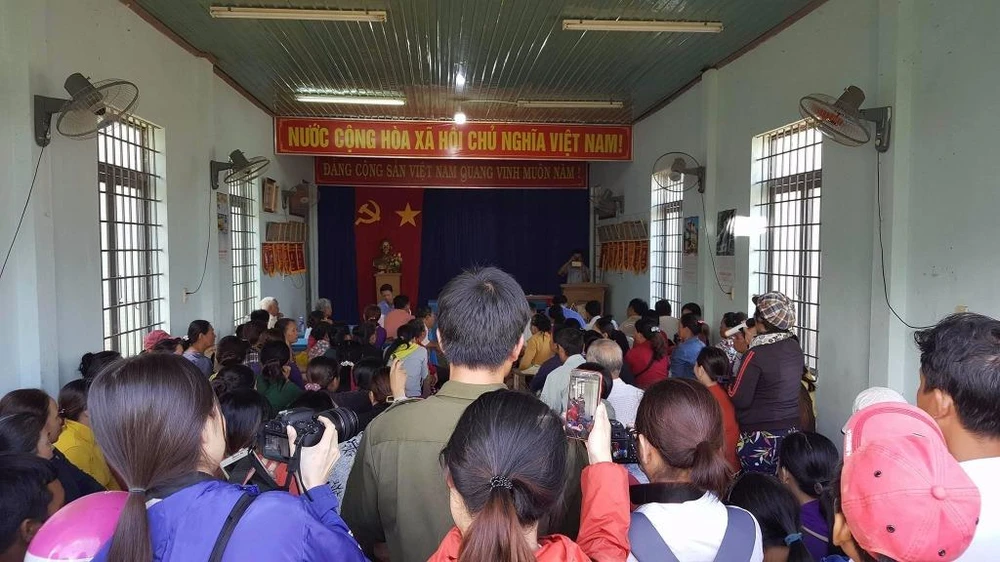 Rất đông người dân, các tiểu thương chợ Điện Bàn và những người dân bị trưởng công an xã đá, vứt hàng hóa đã có mặt ngồi chật kín hội trường thôn 2 theo dõi buổi xin lỗi.