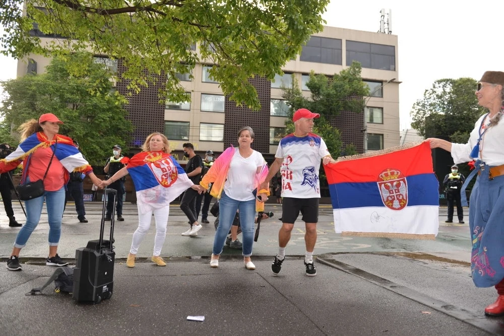 CĐV người Serbia tụ tập trước khách sạn được cho là nơi tạm giam Djokovic. ẢNH: GETTY