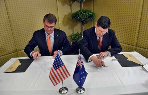 Bộ trưởng Quốc phòng Mỹ Ashton Carter và Bộ trưởng Quốc phòng Úc Kevin Andrews (phải) ký biên bản ghi nhớ tại Singapore ngày 30-5. Ảnh: BỘ QUỐC PHÒNG MỸ
